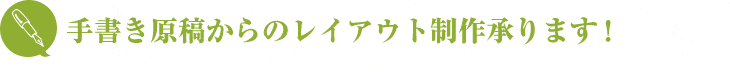 ご自分での入稿データ制作がご面倒な方のために、冊子印刷ドットコムでは手書き原稿からの文字打ち、レイアウト制作を承っております。お気軽にお問い合わせください。